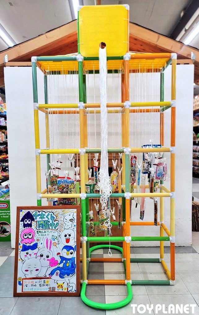 吊り下げられた糸とお菓子が繋がっております。一人一回お好きな糸を引っ張ります、するとお菓子が吊り上がりますので、当たったお菓子をプレゼント!